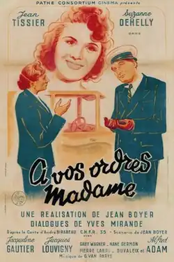 At Your Command, Madame (French: À vos ordres, Madame) is a 1942 French comedy film directed by Jean Boyer and starring Jean Tissier, Suzanne Dehelly and Jacqueline Gauthier. It is based on a story by André Birabeau.[1] It was made by Pathé at the company's Francoeur Studios in Paris. The film's sets were designed by the art director Lucien Aguettand.