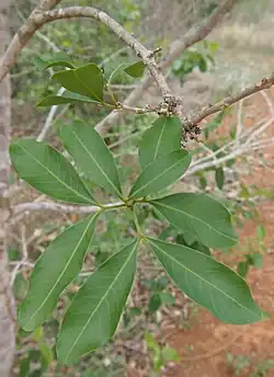 A small tree, up to 10 metres tall, it is usually found growing in dry rainforests on limestone. The species produces characteristic flowers. The leaves are pinnate, usually with only two leaflets. The leaflet bases are very uneven.[1][2]