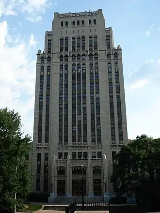 Atlanta City Hall is the headquarters of the City of Atlanta government. It was constructed in 1930, and is located in Downtown Atlanta. It is a high-rise office tower very similar to dozens of other city halls built in the United States during the same time period. Located in South Downtown, it is near other governmental structures, such as the Georgia State Capitol and the Fulton County Courthouse. The Neo-Gothic structure features many architectural details that have helped to make the building a historical landmark.[2] It is Atlanta’s fourth city hall.
