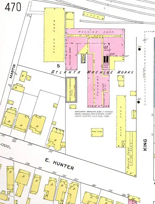 The Atlanta Machine Works was early Atlanta's first foundry and metal fabrication company. in 1848, Austin Leyden together with Robert Findlay and others established a foundry, amassed a fortune and eventually sold the company, called A. Leyden & Co., in 1853 to a business partner. Thereafter it became known as the Atlanta Machine Works and went on to play a central role in the Civil War, producing weaponry and other goods for the Confederacy. The foundry was located at the northwest corner of Hunter (now Martin Luther King, Jr. Blvd.) and King streets,[1][2] now occupied by a larger industrial site only 495 metres (1,624 ft) from the Georgia State Capitol.