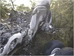 Most of the fuselage was destroyed in the fire.[16] Exceptions included the nose and the underside of the cockpit. The tips of the wings and ailerons were nearly undamaged. The front wing spar was sufficiently intact that it was able to keep the wings together. The inner parts of the wing, including the spoilers, were destroyed, but two of the spoiler actuators were salvageable.[23] The tail was largely intact. Most light alloy components in the engines were destroyed, although the compressor blades were intact and showed no sign of damage prior to impact.[24] Three components – the left main landing gear, an engine cowling and the outer right engine – were found between the runway and the wreckage, and had not been consumed in fire.[16]