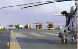 The aircraft landed at a site located 46 metres (151 ft) from the end of the runway and 50 metres (160 ft) from the sea.[16] Once the aircraft had come to a halt, the pilots turned off the fuel supply and activated the engine fire extinguishers. They were not able to order evacuation by intercom, as it was not functioning.[17] The forward starboard door could not be opened due to a jam, while the cockpit and forward port door were both blocked. The pilots evacuated through the left cockpit window, while all surviving passengers evacuated through the aft port door.[15] The pilots attempted to open the jammed front port door, but failed. The commander then re-entered the cockpit to again attempt to open the cockpit door, but failed. By then the heat hindered further attempts. Both pilots were seriously injured in the process. The injured were flown to hospital by air ambulance.[17] Several of the passengers sitting close to the front of the aircraft decided to evacuate towards the aft, as that part of the aircraft was more intact.[18]