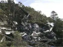 The investigation was carried out by the Accident Investigation Board Norway (AIBN), who arrived by helicopter at the scene at 13:08.[25] Three individuals filmed the accident, of which one was especially useful: from 13 seconds after the aircraft left the runway and subsequent 21 minutes was filmed by a witness across Stokksundet, 1.5 kilometres (1 mi; 1 nmi) from the site of impact. He sold the tape to TV 2, which subsequently handed the video over to AIBN.[19] The investigators concluded that the runway was damp when they arrived, but were not able to conclude if it was wet at the time of the accident.[8] It was nearly impossible to carry out a meaningful investigation of the fuselage because of the heat damage,[23] although the detached left landing gear could be investigated.[19]
