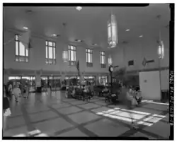 The building design is attributed to architect David A. Rosenstein, although the original plans have been lost. He employed a "modified classic" style that combined both classic and art deco details. Construction began in 1933. The main waiting room formed the center of the building: two stories in height, 78 by 72 feet (24 by 22 m), with a coffered ceiling, terazzo floor, a "...glazed decorative terracotta frieze surrounding the room at the top of the first story level...with plain stepped plaster pilasters reaching to the ceiling above. The space is bright, airy, and pleasant; the high ceiling provides a feeling of spaciousness..." [3] The waiting room was entered from Arctic or Arkansas avenues. Passenger services were all located on the first floor: ticket office, parcel room, telegraph desk, payphones, restrooms, lunch counter and newsstand. The second floor was used by railroad employees. The boarding area had five platforms that extended back 1,400 feet (430 m) with the first 600 feet (180 m) covered.[3]