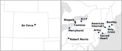 - ^ Robert Morris was a member of Atlantic Hockey from 2010 to 2021 until the program was cut. Subsequent fundraising efforts allowed the program to be reinstated for the 2023–24 season with Robert Morris rejoining Atlantic Hockey.