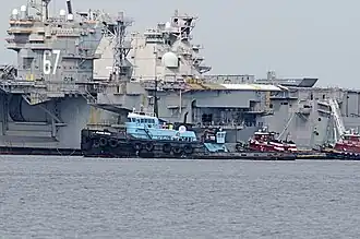 ![]() Atlantic Salvor (center) stands by as ex-USS John F. Kennedy (CV-67) is docked in Philadelphia.