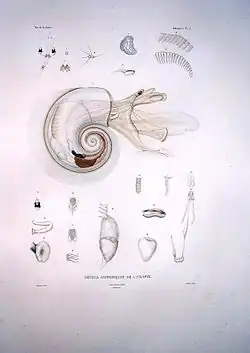 The Atlantidae is a group of holoplanktonic gastropods, which all demonstrate a strong adaptation to pelagic life, in the form of a lenticular, laterally flattened, aragonitic shell, the surface of which is further enlarged by the presence of a wide, and very thin and fragile, double-walled keel.[1] The apex is on the right side of the shell, the umbilicus on the left.[1] For the living animal the enlargement of the shell's surface serves 'to increase stabilization during swimming and sinking'.[1] This phenomenon results in the occurrence of superficially very similar adult shells in separate species, whereas the larval shells may be utterly different.[1]