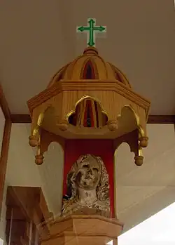 After the persecution of Christians in Japan ended in 1873, Japanese Catholics purchased land in the Urakami Valley district of Nagasaki, where fumi-e interrogations had taken place.[1] On that land, the Urakami Cathedral was built; construction was completed in 1895, and it was consecrated in 1925. Three years later, a wooden altarpiece depicting Mary was constructed, inspired by a painting by the Spanish artist Bartolomé Murillo.[2][3] The statue was constructed in Italy.[4]