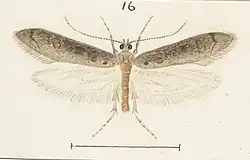 ♂. 23 mm. Head whitish-ochreous. Palpi with second joint fuscous, not reaching base of antennae, scales roughly projecting beneath towards apex, terminal joint sprinkled with fuscous. Antennal joints thrice as long as their apical width, ciliations 5. Thorax fuscous. Abdomen whitish-ochreous. Forewings elongate, narrow towards base, hardly dilated, costa gently arched, apex tolerably pointed, termen nearly straight, very oblique; fuscous, mixed with grey in disc; dorsum suffused with pale ochreous towards base, edged by a blackish raised dot at 1⁄5 of wing; stigmata undefined, pale ochreous, plical nearly beneath first discal : cilia fuscous sprinkled with whitish-ochreous, base spinkled with blackish. Hindwings pale whitish-ochreous, suffused with pale grey except towards apex and posterior part of costa; cilia ochreous-whitish. ♀. 9-10 mm. Forewings ovate-lanceolate; fuscous suffusedly mixed with darker, especially towards base; dorsal area suffused with whitish-ochreous towards base; second discal stigma represented by a raised ochreous tuft edged with dark fuscous. Hindwings rudimentary.[2]