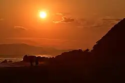 Atsumi Peninsula is noted for its temperate climate, due to the warm Kuroshio Current offshore.[1] The rock formations at Cape Irago, its western tip, and its beaches are part of the Mikawa Wan Quasi-National Park.[1] Administratively, almost all of the peninsula falls within the city of Tahara, with its eastern "neck" within the city of Toyohashi.[1]