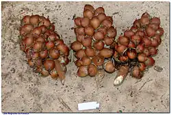 The fruit from the tree is popular in the creation of medicines, beauty aids, and beverages. The palm core can be harvested but its extraction often results in death and is therefore not able to be cultivated due to its importance in the local ecosystem on fauna. The fruit is composed of numerous woody oblong fruits looking similar to small coconuts.[6]