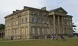 Attingham, including Cronkhill, was the seat of the Barons Berwick from the 1780s until that title became extinct in 1953. On the death of Thomas Henry Noel-Hill, 8th Baron Berwick (1877–1947), who died childless, the Attingham Estate, comprising the mansion and some 4,000 acres (1,600 ha), was gifted to the National Trust.[11][12] Attingham Park was designed by George Steuart, a follower of James Wyatt and encapsulated Tern Hall. It is the only remaining example of a country house by Steuart; he later designed St Chad's Church, Shrewsbury.[9] It was built from 1782 to 1785 for Noel Hill, 1st Baron Berwick. Lord Berwick, a former MP for Shropshire, received his title in 1784 during the premiership of William Pitt the Younger, during which he had been instrumental in the reorganisation of the East India Company.[10] The proportions have been criticised: for Simon Jenkins "The façade is uncomfortably tall, almost barracks-like, the portico columns painfully thin".[9] There is a large entrance court, with an imposing gatehouse, and two single storey wings stretch out to either side of the main block. The main reception rooms were divided into a male and female set on either side of the house.