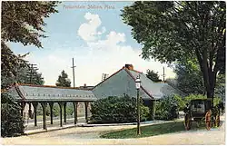 The 1881 station was constructed in Richardson's signature Richardsonian Romanesque style, with influence from Japanese architecture as well as Romanesque Revival architecture. The one-story building was built from "red and light grey granite", with "heavy masonry and dominant roof."[9] The interior was divided into a pair of waiting rooms for men and women, with a ticket counter between.[11] The platform was shaded by a canopy, which wrapped around the east end of the building into a porte-cochère.[9][10] Construction, by the Norcross Brothers firm, cost $16,290.[11] As with a number of other stations on the line, Frederick Law Olmsted designed the landscaping, which included large trees, shrubs, and Japanese ivy.[9][10][11] A replica of the station, still standing, was built by the Buffalo, Rochester and Pittsburgh Railway in 1911 in Orchard Park, New York.