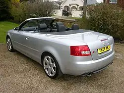 The Audi B7 platform Audi S4 quattro, based on the Audi B7 A4, debuted in late 2004. Although Audi classifies it as a new car, the differences between it and the outgoing B6 S4 casually appear to be primarily cosmetic, and is still classified by the internal designation: Typ 8E (although with revised sub-designations - saloon: 8EC, Avant: 8ED, and Cabriolet: 8HE).[1] It has the same 4.2-litre V8 engine (identification code: BBK) as the B6 S4, producing a power output of 253 kW (344 PS; 339 bhp) at 7,000 rpm, and 410 N⋅m (302 lbf⋅ft) of torque at 3,500 rpm.