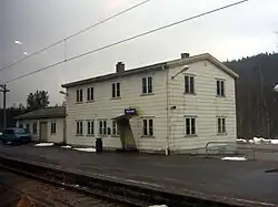 Like the other stations along the Sørlandet Line, the station building received a standardized design. It was built in the overall Neoclassical architecture style adapted in the 1920s. By the 1940s the designs had been altered to include elements of functionalism.[6] Audnedal received an identical station building to that of Storekvina Station. The 180 square meters (1,900 sq ft) building is wooden with a concrete foundation. It has siding in asbestos cement and a gable roof. The building consists of a main section, where the lower story originally featured a ticketing and waiting room, and an upper story with the station master's residence. The annex was allocated cargo handling. There is also a 35-square-meter (380 sq ft) shed housing the interlocking controls, dating from 1968.[2] Today the station building features a waiting room and a washroom, open around the clock except from 21:00 on Saturday to 07:00 on Sunday.[5] The upper part of the station serves as a residence.[3] There is free parking for 30 cars at the station.[5]
