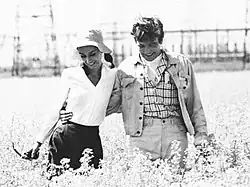 The same year, Hepburn also starred in William Wyler's drama The Children's Hour (1961), in which she and Shirley MacLaine play teachers whose lives are destroyed after two pupils accuse them of being lesbians.[87][88] Bosley Crowther of The New York Times writes that the film "is not too well acted", with the exception of Hepburn, who "gives the impression of being sensitive and pure" of its "muted theme".[87] Variety magazine also compliments Hepburn's "soft sensitivity, marvelous projection and emotional understatement", adding that Hepburn and MacLaine "beautifully complement each other".[88]