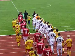 Over the years German national football teams have come to play matches at the Auestadion. In August 2019, the German national women's team faced Montenegro at the stadium in a European Championship 2021 qualifier. The German team, who were world champions at the time, defeated Montenegro 10−0 with German captain Alexandra Popp scoring a hat-trick of goals before being substituted just before the hour mark.[23] The match was watched by 6,275 fans inside the stadium.[24] The German women's team had previously played two other matches at the stadium. In May 2008 when they faced and defeated Wales 4−0 in a Euro 2009 qualifier.[25] In September 2001, The German women took on England in a FIFA World Cup qualifier in front of 7,720 fans. Germany defeated England 3−1 with two goals to striker Sandra Smisek, one goal to Martina Müller and a consolation goal for England scored by Rachel Yankey.[26] The German women's U20 national team under the guidance of Maren Meinert played a friendly at the stadium in October 2015 against Sweden. Both sides used the match as preparation for the 2016 FIFA U-20 Women's World Cup in Papua New Guinea. Sweden won the match 1−0 with the second half goal in the 53rd minute to Anna Oskarsson. The City of Kassel arranged for 200 refugees to attend the match.[27] In September 2016, the German U21 national team played a friendly match at Auestadion against Slovakia. The match marked the U21 national team head coach debut of Stefan Kuntz.[28] In front of 6,890 fans, Germany won the match 3−0 with goals to Grischa Prömel, Niklas Stark and Levin Öztunali.[29] Previously, the U21 national men's team had played two matches at the stadium. In October 2013, Germany played the Faroe Islands in a 2015 U21 Euro qualifier. In a close match, Germany prevailed 3−2 winners in front of 8,340 spectators. Robin Knoche, Kevin Volland and Amin Younes scored the goals for the home team, Árni Frederiksberg and Hørður Askham scored for the visitors.[30] In March 2011. Germany took on Italy U21s in a friendly match. With 16,368 supporters in attendance, Italy and Germany played out a 2−2 draw. Germany took a 2−0 lead through two goals to Lewis Holtby before Italy staged a comeback to draw level with late second half goals to Manolo Gabbiadini and Fabio Borini.[31] The attendance for the match broke a German record for an under 21 game.[32] On 16 September 2011, the German U17 national team played at the stadium in a friendly match against Israel. Germany proved too good for the visitors and claimed a 5−0 victory. Said Benkarit scored a hat-trick before Max Meyer and Serge Gnabry completed the rout.[33]