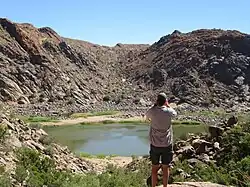 The original Khoekhoe people named the waterfall Ankoerebis, meaning the "place of great noise".[5] The Khoi and San communities within the greater national park inhabit domed huts called matjiehuise, 'mat houses'. The huts are ideal for both hot and cold climates. During hot temperatures the tree stems from which the mats are created shrink, which allows gaps to appear – creating a cooling ventilation system. The inverse occurs during cold climates, as the stems expand to keep the cold out.[6] The Trekboers who later settled in the area derived the name Augrabies. The name is sometimes spelt Aughrabies. There are many deposits of alluvial diamonds along the Orange River and legend has it that the biggest cache of diamonds in the world lies in the swirl-hole eroded into the granite at the foot of the waterfall by the thundering waters.[7]