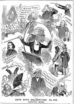 Manns retained the position of director of music until his retirement in 1901, undertaking few outside engagements. At the Crystal Palace he also conducted the triennial Handel Festivals, from 1883. He took on the 1883 festival at a few hours' notice, when the established conductor, Sir Michael Costa was unwell.[2][9] He was at first regarded as less successful as a choral conductor than in the orchestral repertory; his beat was eccentric and puzzling to the uninitiated.[10] He was, nevertheless, invited to conduct all the subsequent festivals up to and including 1900. He directed the orchestral concerts of the Glasgow Choral Union for thirteen seasons in succession.[2] He conducted the promenade concerts at Drury Lane in 1859, and was conductor of the festivals of Sheffield in 1896 and 1899,[2] and Cardiff in 1896.[10]