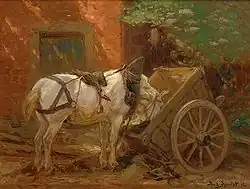 "Schimmel mit Zaumzeug frisst aus dem Gemüsewagen/Grey in harness feeding from vegetable cart"