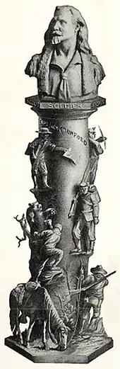 [S]culptor August Zeller completed a clay bust of Captain Jack, which was then cast in bronze. The finished bust was mounted on a tall pedestal, bedecked with small figures depicting Crawford's life in the West. Crawford and Zeller were both delighted with the sculpture, with Zeller writing to Jack: "It has even surpassed my highest expectations." Thereafter, the Poet Scout often pictured the bust in his publicity brochures.[19]