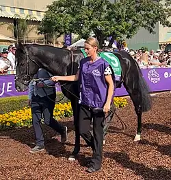 ![]() Auguste Rodin being led in the paddock before the 2023 Breeders Cup Turf | |