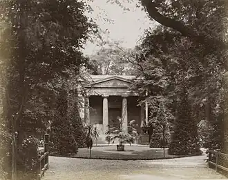 Auguste was given a large allowance and allowed to continue to live at the royal estate in Sanssouci Park, Potsdam. During her widowhood, she established her household in Villa Liegnitz, near Neues Palais, which was, after her death, given to her husband's great-granddaughter, Princess Charlotte of Prussia. In her later years, Auguste traveled a lot, often visiting Italy, Switzerland, Great Britain and France. She was godmother to her nephew, Count Ferdinand von Harrach, a painter from the younger, Upper Silesian branch of the Harrach family. As one of Auguste's designated heirs, the inheritance from his aunt gave him the opportunity to acquire Tiefhartmannsdorf castle (Lower Silesia) in 1874, previously owned by the von Zedlitz noble family.[1]