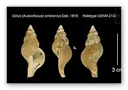 | Shell of Aulacofusus ombronius (holotype at the Sùithsonian Institution) | |