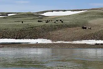 The park has the highest concentration of muskoxen on earth, with estimates of 68,000 to 80,000 animals on the island, approximately 20% of which are thought to reside in the park.[4][9] It is also home to the endangered Peary caribou as well as the more common barren-ground caribou.[4][9] Ptarmigan and ravens are considered the only year-round birds in the park, although 43 different species make seasonal use of the area.[10] The park is completely treeless.[11] It has 150 species of flowering plants.[12] Arctic foxes, brown and northern collared lemmings, Arctic hares and wolves roam the rugged terrain. Marine mammals along the north coast include polar bears, ringed seals, bearded seals, beluga whales and bowhead whales. Birds of prey in the park include snowy owls, rough-legged hawks, gyrfalcons, and peregrine falcons, who feed on the lemmings.[9][10]