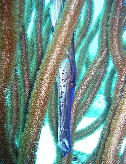 Aulostomus maculatus, the West Atlantic trumpetfish, is a long-bodied fish with an upturned mouth. It often swims vertically while trying to blend with vertical coral, such as sea rods, sea pens, and pipe sponges.