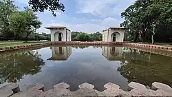 This pavilion was built by the Mughal emperor Shah Jahan. Like most Mughal gardens, it had channels of water culminating in ornate tanks and several fountains. The layout is designed in the mughal style of chaharbagh style. The pavilion has patches of wall-paintings that survived till date.[8]