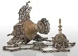 The Ner Tamid (Hebrew for eternal light) was found, along with other items, during the archaeological work carried out in the area of the Great Synagogue on Berka Joselewicza Street in 2004.[11] The lamp was most often hung above or by the Aron Kodesh (previously in a niche on the western wall of the synagogue) and was lit regardless of whether the synagogue is empty or closed. This tradition is meant to remind of the constantly lit menorah in the ancient Temple of Jerusalem.