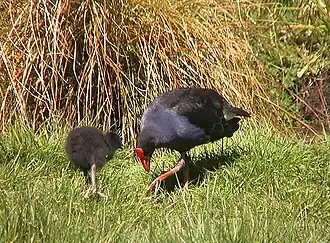 Their foraging habits extend beyond natural environments, often leading them to forage on roadsides, where they seek out invertebrates struck by vehicles and graze on grass shoots from mown verges. In these areas, they also ingest grit, which aids in processing food in their gizzards.[15] Swamphens are bold foragers and have a history of raiding gardens for crops such as kumara and taro, a behaviour that has continued as they adapted to European farmland by feeding on grain and vegetable crops.[8] Their foraging activities can sometimes result in the uprooting of vegetation, including tree seedlings and crops, which has led to pūkeko being culled under permit in certain areas.[16]