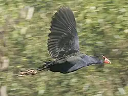 Although it is thought that P. porphyrio subspecies rarely use flight, this lineage has effectively dispersed, colonised, and established populations numerous times across extensive bodies of water.[7] In support of the belief that Australasian swamphens are good flyers, and may have self-introduced, a dead bird was found on L'Esperance Rock, a tiny, isolated rock in the Kermadec group of New Zealand, more than 200 km from the nearest established population.[10] This demonstrates the ability of swamphens to fly great distances over the sea.[11]