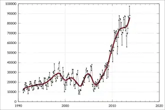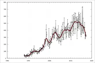 In the build-up to the Indonesian invasion of East Timor in 1975, five Australian journalists were killed in the East Timorese border town of Balibo. According to a 2007 Australian coronial enquiry, the journalists were deliberately shot by members of the Indonesian special forces.[44] According to Indonesia, the men were killed in cross-fire between the military and pro-independence militia.[45] Gough Whitlam made assurances that Australia would not intervene in the conflict, and encouraged Indonesian action to take over East Timor in 1975 on the basis of concerns over the left-leaning Fretilin movement. Subsequent killings and famine eliminated one-third, or 200,000, of the territory's population.[46] The new Australian Prime Minister Malcolm Fraser met Suharto in October 1976,[47] offering de facto recognition of the Indonesian annexation of East Timor, which was followed by Australia's de jure recognition in 1979, the only foreign government to afford complete recognition of the incorporation.[37][48] The Balibo Five proved a significant sticking point in the relationship between Australia and Indonesia, a weakness which was compounded by a 1986 Sydney Morning Herald article which discussed Suharto's business dealings in a negative light.[49] The growing prominence of trade and investment for the relationship, however, led to the steady growth of trade between the two countries beginning in the 1980s, with average growth of up to 19%.[49]