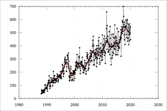 The relationship has been characterised by growing mutual trade of A$17.8 billion in 2018–19, an increase of 6.9% over the previous year, in addition to close links in government, education, and defence under the Lombok Treaty.[4][5] Both nations are members of the G20, ASEAN Regional Forum, the Asia-Pacific Economic Cooperation (APEC), the ASEAN Free Trade Area, the Indonesia–Australia Comprehensive Economic Partnership Agreement (IA-CEPA) and the Regional Comprehensive Economic Partnership (RCEP), among other organisations.[6]