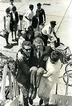 A highly prevalent concern of Australian athletes at the 1968 Paralympic Games was the accommodation and facilities that were provided in Israel. While the women athletes and other nations like America were in the rooms at the Kfar Maccabiah or Ramat-Aviv hotels, the male athletes on the Australia team were provided makeshift rooms in the carpark area beneath the high-rise building.[8][18][5] The grounds were covered in plastic, athletes were provided camp stretchers with straw mattresses, that were replaced by the Australian team and staff with mattresses.[8][5] There was one shower for all the men that was said to not have proper plumbing and very quickly overflowed and slightly flooded the area they were living in and one toilet.[18][8][5] It is believed mosquitos were also present in the area in which the Australian team were living.[8] The food provided was described by some of the Australian athletes as insufficient and unappetising, however, this may reflect cultural and cuisine differences and not the quality or nutritional content of the food. Multiple athletes on the Australian team, however not all athletes at the Games, have stated that these factors created some unpleasantness and reduced enjoyment of their experience at the 1968 Paralympic Games. The travel to and from the Games is not widely documented and as the image shows, the athletes were carried onto the planes in Australia heading to Israel and reports from the Daphne Hilton in the NLA interviews (NLA) state that a forklift was used to transport the passengers off the plane in Israel. During the Games, athletes travelled by bus to the venues and were almost always accompanied by Israeli female army officers.[8][5][18]