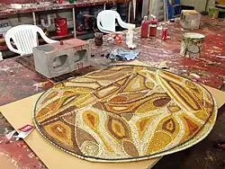 In 1995 a number of women's centres across the Central Desert were set up with the help of Thisbe Purich, who introduced the women there to basket coiling techniques. As the central body of the coil could be made from local grasses, this required little in the way of infrastructure or imported materials.[17] Only the loose binding for the coils, typically coloured wool or raffia, needed to be bought. This technique spread quickly, and by 2001 the first known sculptural works were produced. These were created by the artist Kantjupayi Benson, and included an emu followed by a dog and set of “camp crockery”.[18] In 2005, the large scale work Tjanpi Grass Toyota won the 22nd National Aboriginal & Torres Strait Islander Art Award. Tjanpi Desert Weavers is the best known art centre working in this tradition.