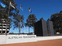 The Australian Peacekeeping Memorial, located at the southern end of Anzac Parade in Canberra, Australian Capital Territory, commemorates the service and sacrifice of all Australians who have served on peacekeeping or peacemaking missions around the world. It was inaugurated on 14 September 2017 by the Governor-General of Australia, General Sir Peter Cosgrove AK MC. The Memorial is a living memorial that commemorates the service of all Australian peacekeepers- past, present and into the future.