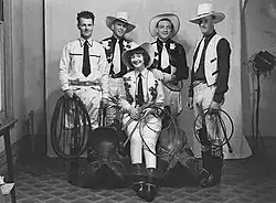 Proprietors such as Thorpe McConville, plus the outstanding buckjump riders; Lance Skuthorpe, Australian Indigenous roughrider Billy Waite,[4] the Gill family, Bibby Bros and Colin McLeod ran travelling roughriding shows. These shows increased the popularity of roughriding throughout much of Australia.[5] In 1908 the Australian Buckjumpers Limited were formed and featured celebrated roughriders including Waite, Jack Dempster, Fred Morton and Cecil Miller.[6] The travelling rodeos provided displays of riding bucking horses and bullocks, whipcracking, performing dogs and ponies and rope-spinning. By 1930 the Great Depression left only a few of these travelling shows on the road.[3]