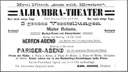 Advertisement for "Pariser-Abend" (Paris evening) and "Herren-Abend" (gentlemen's evening) with erotic movie screenings of the "wandering cinema", Alhambra-Theater, 1906.