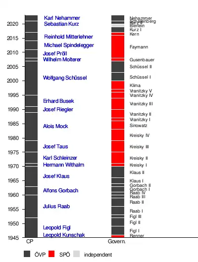 The chart below shows a timeline of ÖVP chairpersons and the Chancellors of Austria. The left black bar shows all the chairpersons (Bundesparteiobleute, abbreviated as CP) of the ÖVP party and the right bar shows the corresponding make-up of the Austrian government at that time. The red (SPÖ) and black (ÖVP) colours correspond to which party led the federal government (Bundesregierung, abbreviated as Govern.). The last names of the respective Chancellors are shown, with the Roman numeral standing for the cabinets.