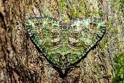 The expansion of the wings is 1+1⁄4 inches. The fore-wings are dark greyish-brown or purplish-brown, with the veins and margins broadly marked with bright green; there are numerous irregular wavy blackish streaks forming three very ill-defined darker transverse bands; the first at the base; the second from about one-fourth to two-thirds, usually with a paler central area; and the third near the termen outwardly edged with white. There is a series of fine black terminal marks and the cilia are dark brown. The hind-wings are cream-coloured tinged with very pale reddish-brown, darker towards the dorsum, with numerous pale brown wavy transverse lines. There is a series of black crescentic marks on the termen, and the cilia are pale reddish-brown.[8]