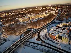 These new planned suburbs, located at the periphery of the metropolitan area, were advertised as a means of escaping the congestion and pollution associated with inner-city living in the early to mid-20th century.[10] The development of replicable integral neighbourhoods, and processes of urban renewal (characterised by the development of street infrastructure) facilitated a suburban exodus from cities during this period, resulting in the dispersion of the western metropolis.[8][12] In a short space of time, a considerable burden was placed on the transit networks of many major North American cities, as processes of urbanisation created entire communities, isolated from what were popularly viewed as obsolete modes of mass transit, of automobile dependent commuters.