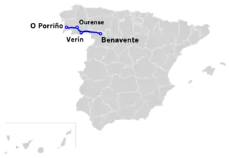 The A-52 is a motorway in northwestern Spain. It starts at Vigo heads east from the town crossing the Autopista AP-9 and then the N-550/Autovía A-55. It then goes over the Rio Tea running parallel to the N-120 and along the Rio Miño. At Ourense the road turns south out of the valley in conjunction with the N-525. It passes over the Alto de Allariz (725m) and Alto de Estivadas (900m). At Verín the N-532 heads 13 km south to the Portugal frontier where it becomes the E-801/A-24/IP-3.