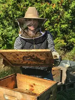 Ava Roth is a contemporary Canadian artist based in Toronto, Ontario. Her work ranges from encaustic painting to embroidery to weaving, often combining multiple artistic media into a single piece of art. Her "Honeycomb Collection" series combines framed embroidery and other natural and man-made objects, with natural honeycomb. To create this ongoing series, Roth places objects and art-pieces into beehives located throughout southern Ontario. In the hives, the bees construct honeycomb around them.[1][2] The artworks produced are thus the result of interspecies collaboration. According to Roth, her work is "fundamentally about exploring the relationship between humans and the natural environment."[3]