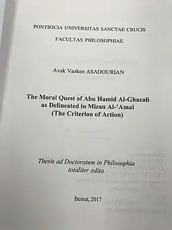 - ^ Avak, Asadourian (2017). The Moral Quest of Abu Hamid al-Ghazali as delineated in Mizan al-'Amal (The Criterion of Action). Beirut: Pomigravure Printing House. ISBN 978-9953-0-3917-6.