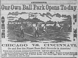 Avenue Grounds was a baseball field located in Cincinnati, USA. Also known as Brighton Park and Cincinnati Baseball Park,[1] the ground was home to the Cincinnati Reds baseball club from April 25, 1876, to August 27, 1879.[2] The ballpark featured a grandstand that could seat up to 3,000 fans. It was approximately 2 miles (3.2 km) north of the Union Grounds, where the original professional team from the area, the Cincinnati Red Stockings, played, and was approximately 4 miles (6.4 km) from the heart of the city,[3] so horse-drawn streetcars and trains were a popular way to travel to the park.[4] The ballpark had first opened in 1875,[1] and would continue to be used for various types of amateur sports until at least the mid-1890s. The major league club of 1876–1879 played poorly, and actually dropped out of the league after the 1879 season. The club revived for 1880, and relocated to the Bank Street Grounds.