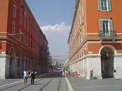 Laid out in 1864[3] under the general plan of the Consiglio d'Ornato dating to the period when Nice was ruled by the Counts of Savoy, the street was constructed in a natural valley, the Saint-Michel Valley[4] beginning at Place Masséna and lining up with the Pont-Neuf. It reflects the will of the authorities of this time to control development of the modern city on the right bank of the Paillon.[5]