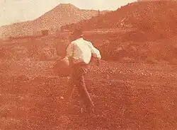 Berthold liked to photograph farmers when they were working. Farmer who was bent down to reach the earth in his specific gestures, showed the type of a person connected with the past and time, when people were still more connected with the nature, when they were fully dependent on it. Berthold had numerous occasions to watch the farmers at their day work in the surrounding area of Škofja Loka, where he walked around the paths, hills and villages. His most famous work is the photography of The sewer, which was made in 1906 at the area around Škofja Loka, somewhere between the villages Pungert and Gosteče. Photography probably wasn't made randomly between hiking, most probably it is a selectively defined composition. The figure, position and moves of the farmer are organised and the whole composition is lighting balanced. A year after the photography was made, the painting of Ivan Grohar – The sower was made, which differs from the original only by the hayrack, which instead of the hill is painted a bit blurred in the background. Most probably Ivan Grohar was looking at Berthold's photograph, which was the usual practice of Slovenian impressionist painters at that time. The motive is also engraved on the 5-cent Euro coin in current times, which was designed by Miljenko Licul.